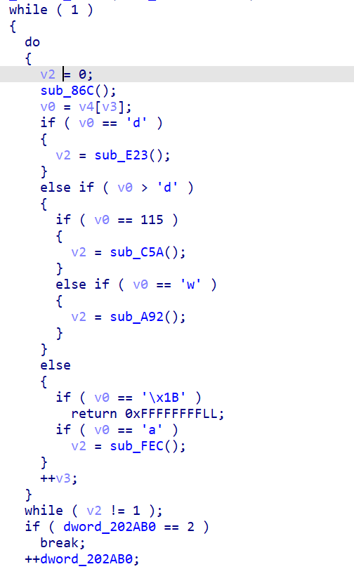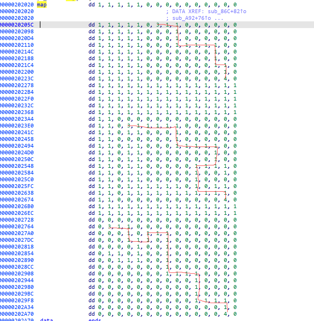 所以当全局int变量看就好了,不难看出,3代表当前位置,202AB4记录当前行,202AB8记录当前列,但是这个迷宫是用一维数组存储的所以会有15*i+j,那225*dword_202AB0是啥,不知道,回原来的函数看看