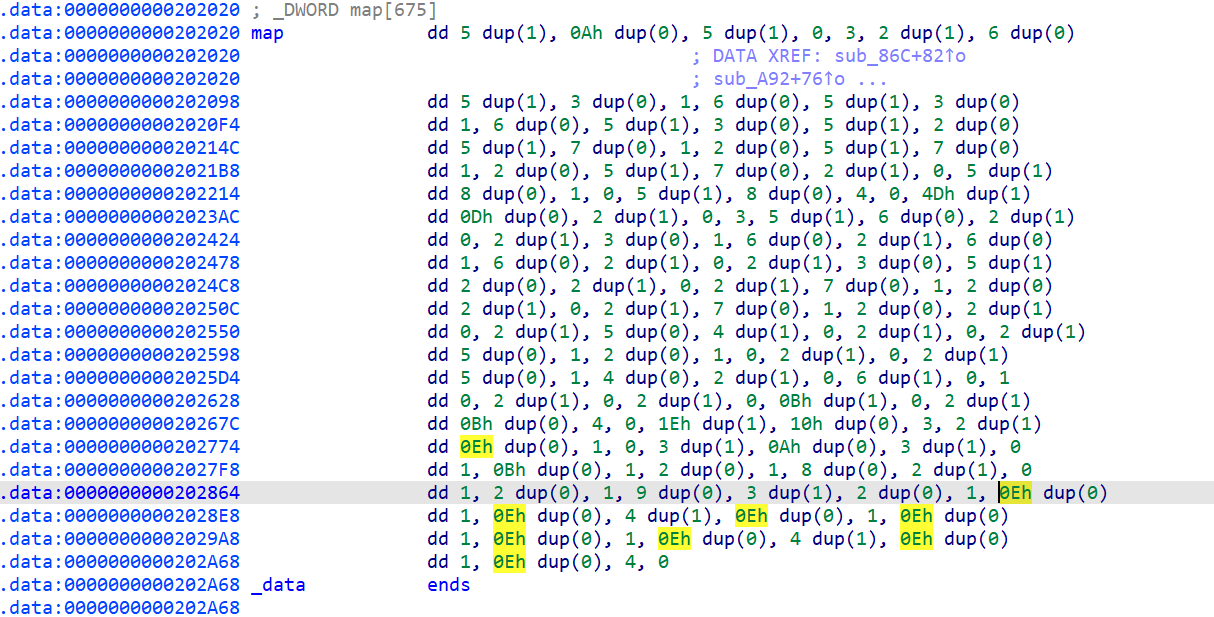 可以看出迷宫应该是一个15*15的,且dword202020应该是地图数组